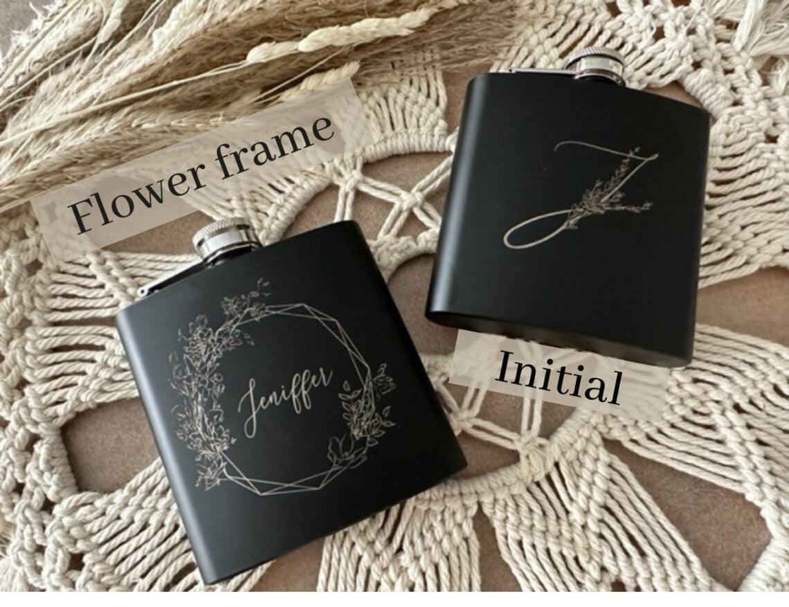 This engraved custom floral design flask is a perfect gift for bridesmaids proposals, bachelorette parties, holidays, birthdays and more! This listing is for a black flask.