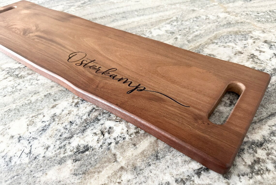 Our custom charcuterie cheese boards are the perfect gift for both family and friends. These personalized cutting boards are also excellent gifts for weddings, anniversaries, and housewarmings. Whether you’re displaying this one-of-a-kind piece as art in your kitchen or prepping the family dinner, this wood cutting board provides a unique and personal touch.